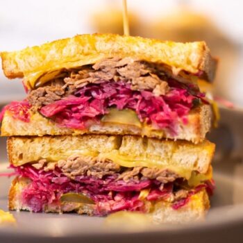 Plátky ražného chleba s hovädzím mäsom, syrom, kyslou kapustou a domácim pikantným ruským...
