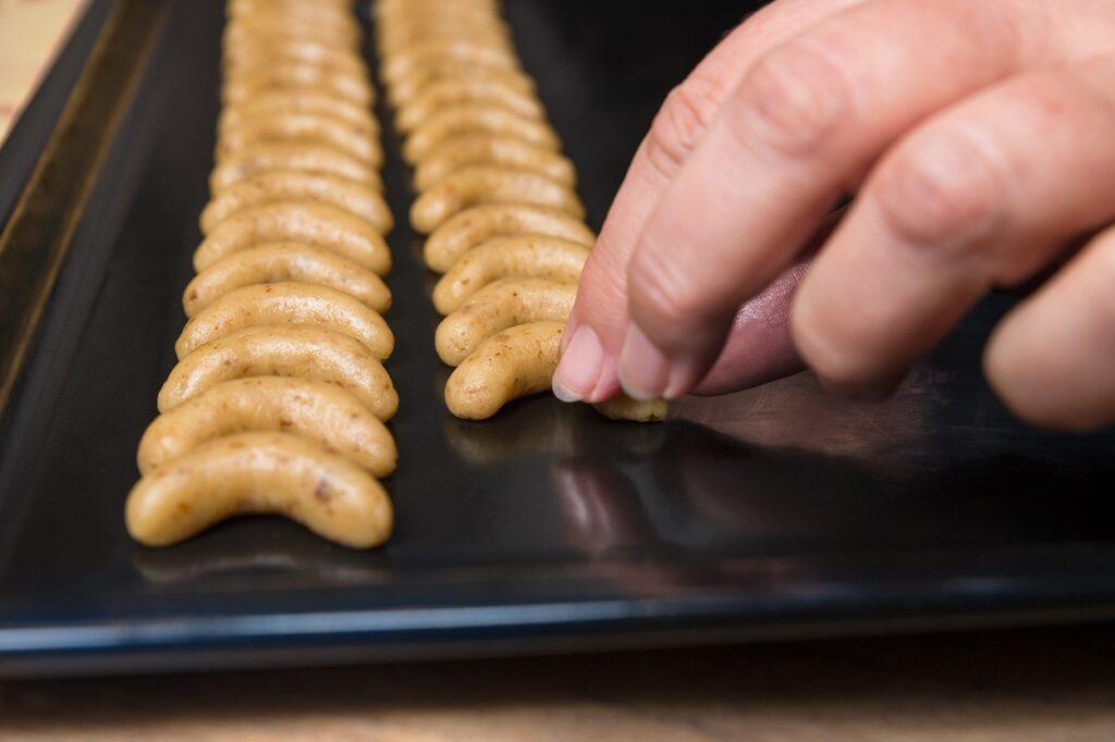 - Z vychladeného cesta sa neskôr odoberajú malé kúsky a formujú sa do tvaru malých rožtekov (polmesiačikov). Aby sa cesto nelepilo na pracovnú plochu, rožky sa odporúča tvarovať v rukách.